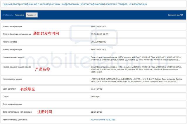 网站披露的一份注册文件显示,HTC共登记了Wildfire E,Wildfire E Plus,Wildfire E1,Wildfire E1 Plus,Wildfire E2,Wildfire E2 Plus,Wildfire E3,Wildfire E3 Plus,Wildfire R和Wildfire R Plus等十个手机型号,制造商是一家名为财富之舟(Fortune Ship)的ODM/OEM公司。该文件发布于5月6日,产品注册有效期为2019年5月22日至2028年1月7日。