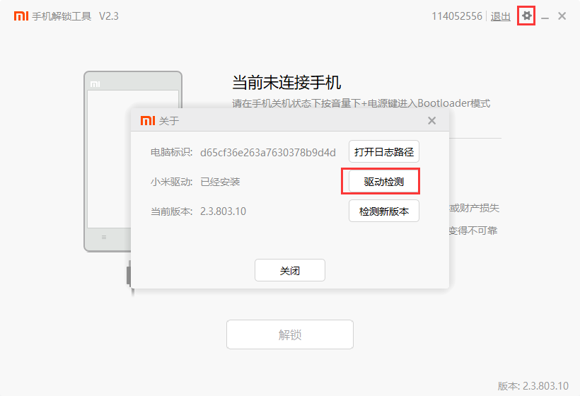 六、点一下右上方【设定】标志,点一下检验,检验电脑上是不是安裝了小米驱动,沒有得话点一下安裝就可以。